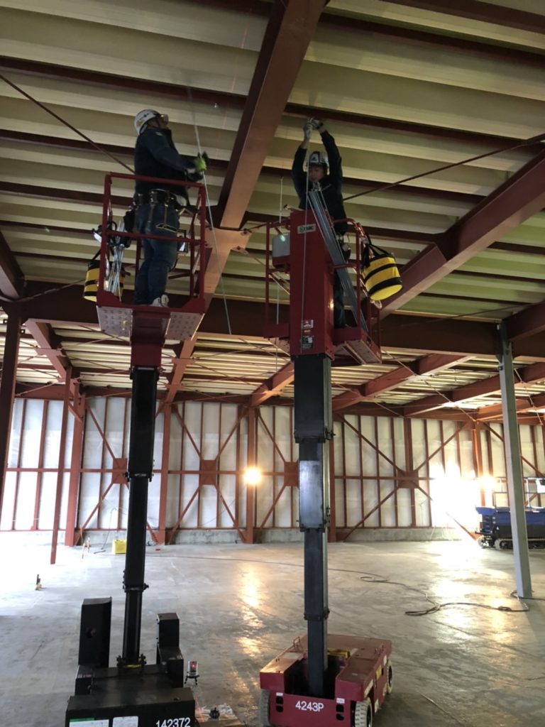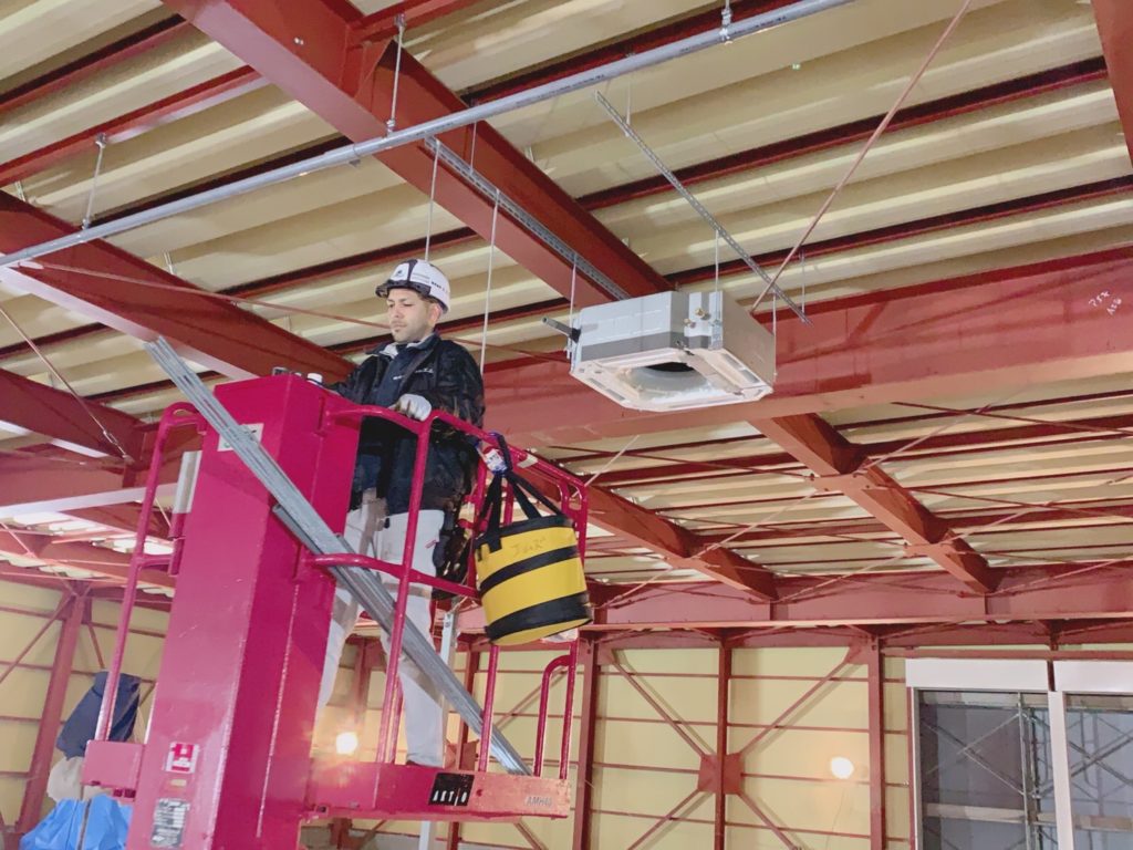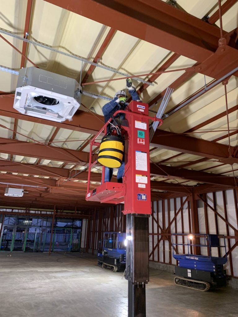 本日のパッケージエアコン工事は、某店舗の新設工事で、高所作業車を使っての吊り込み作業でした。