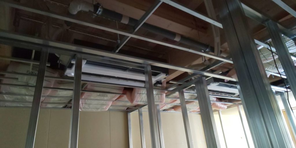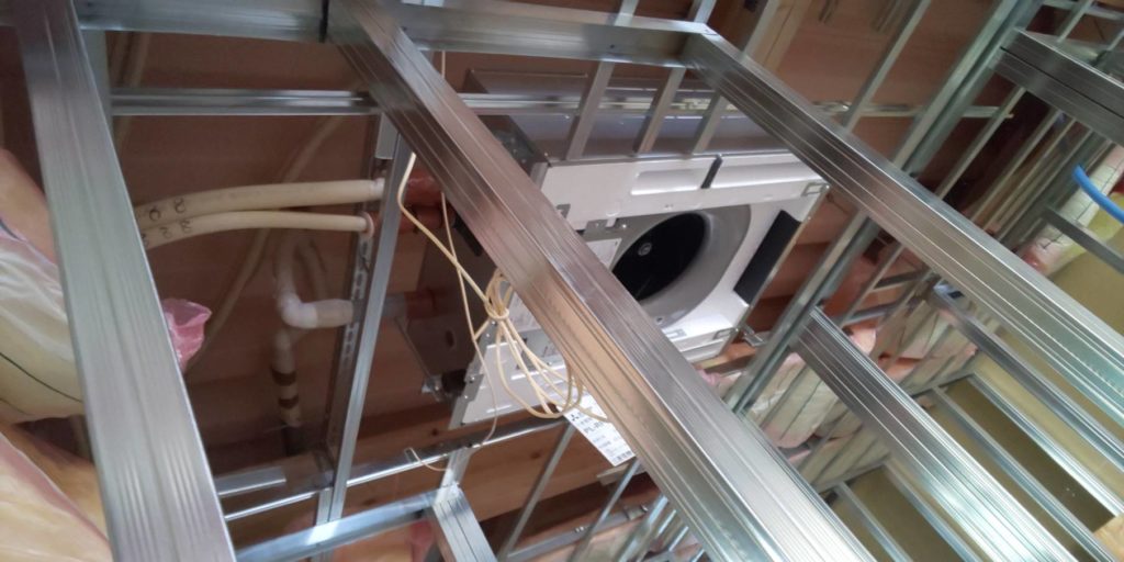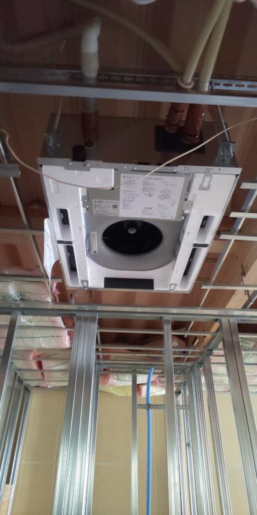 室内機吊り込み作業、及びパネル設置、室外機繋ぎ作業です!